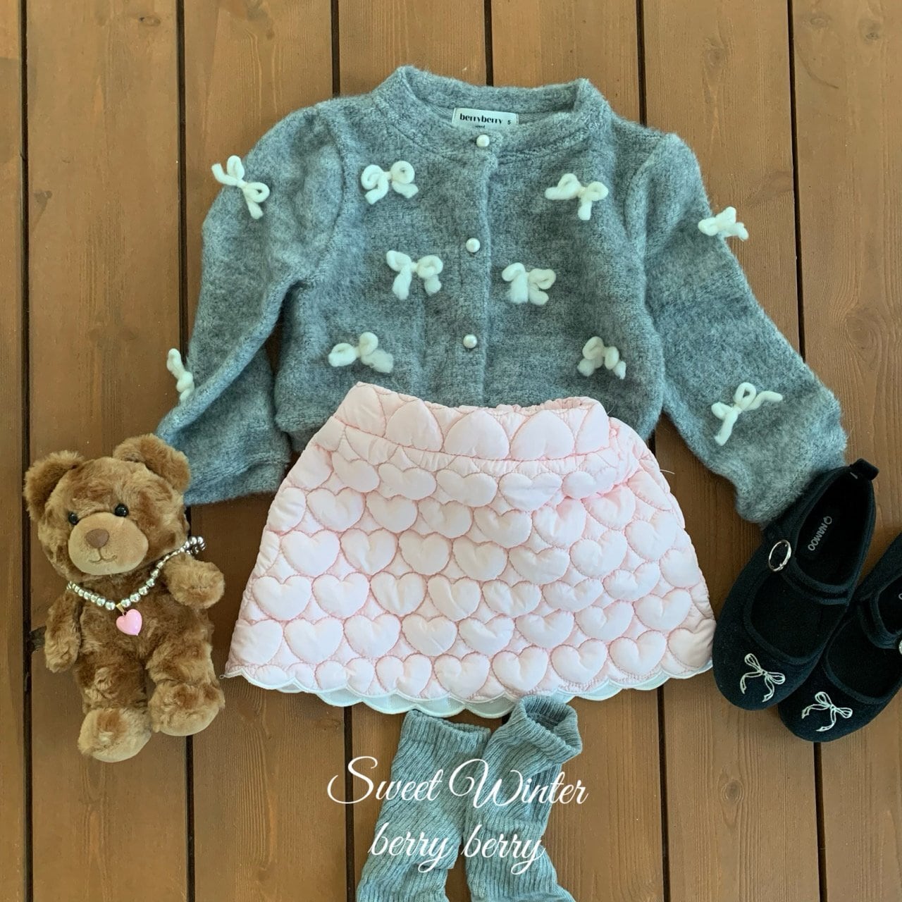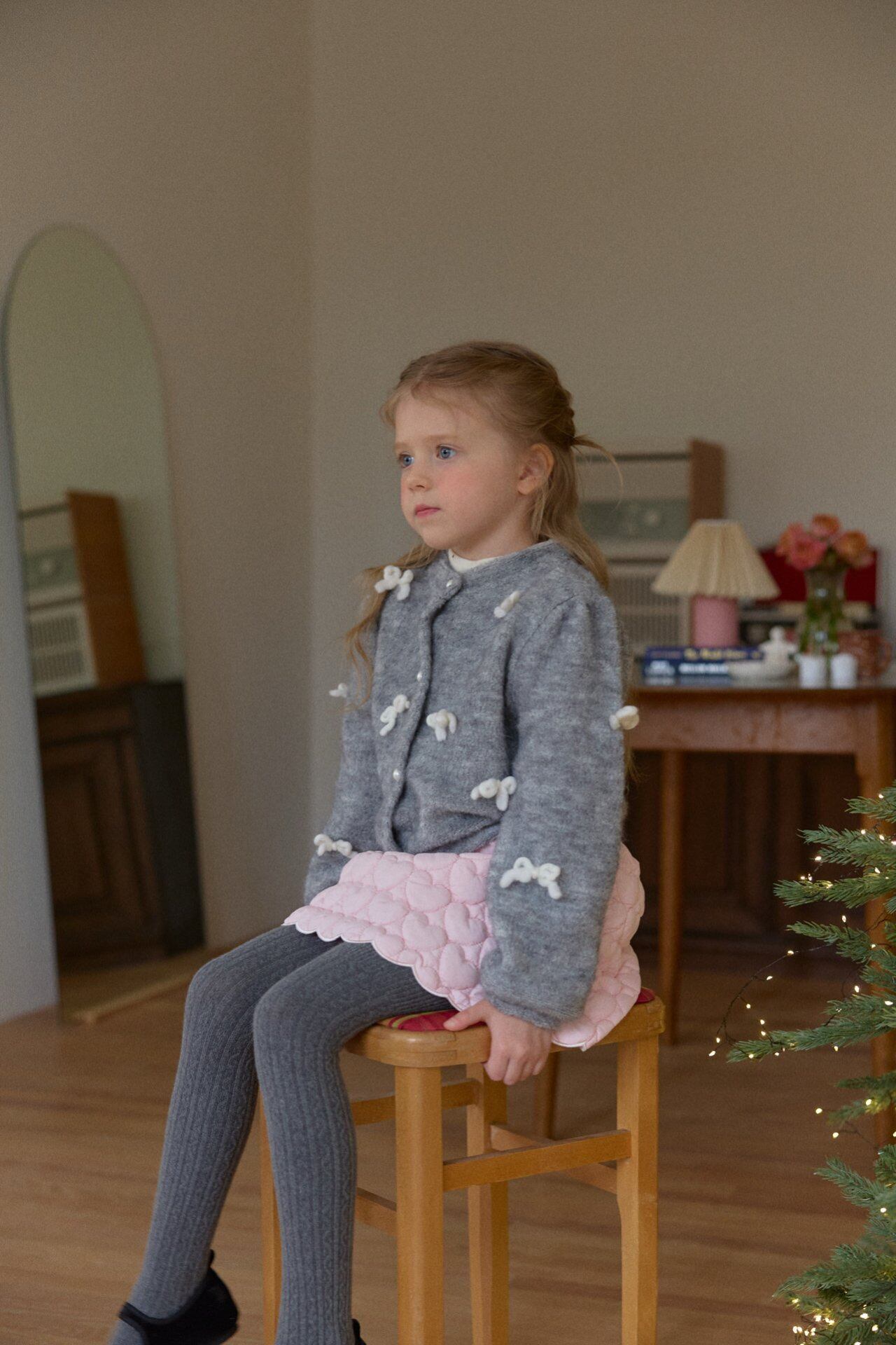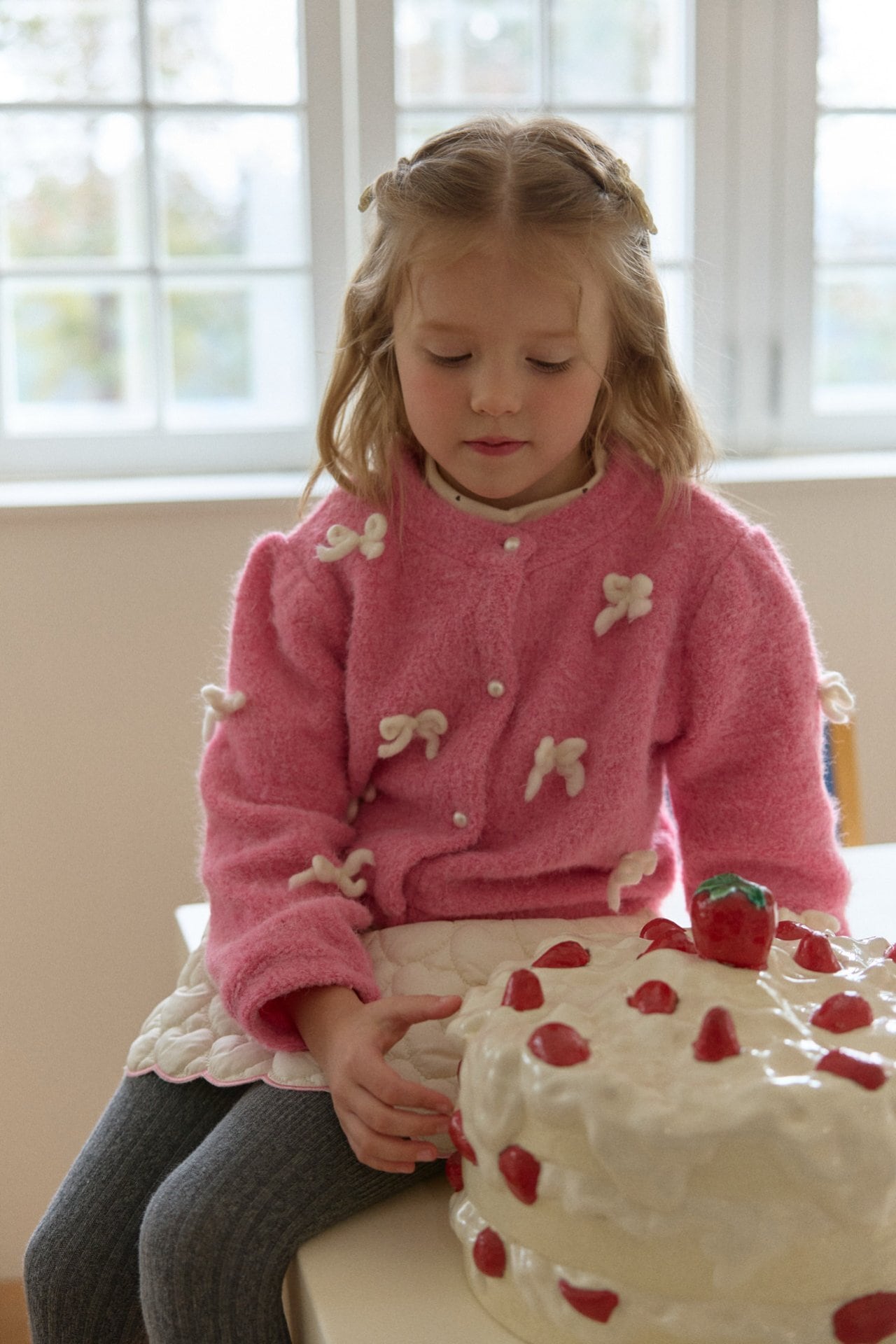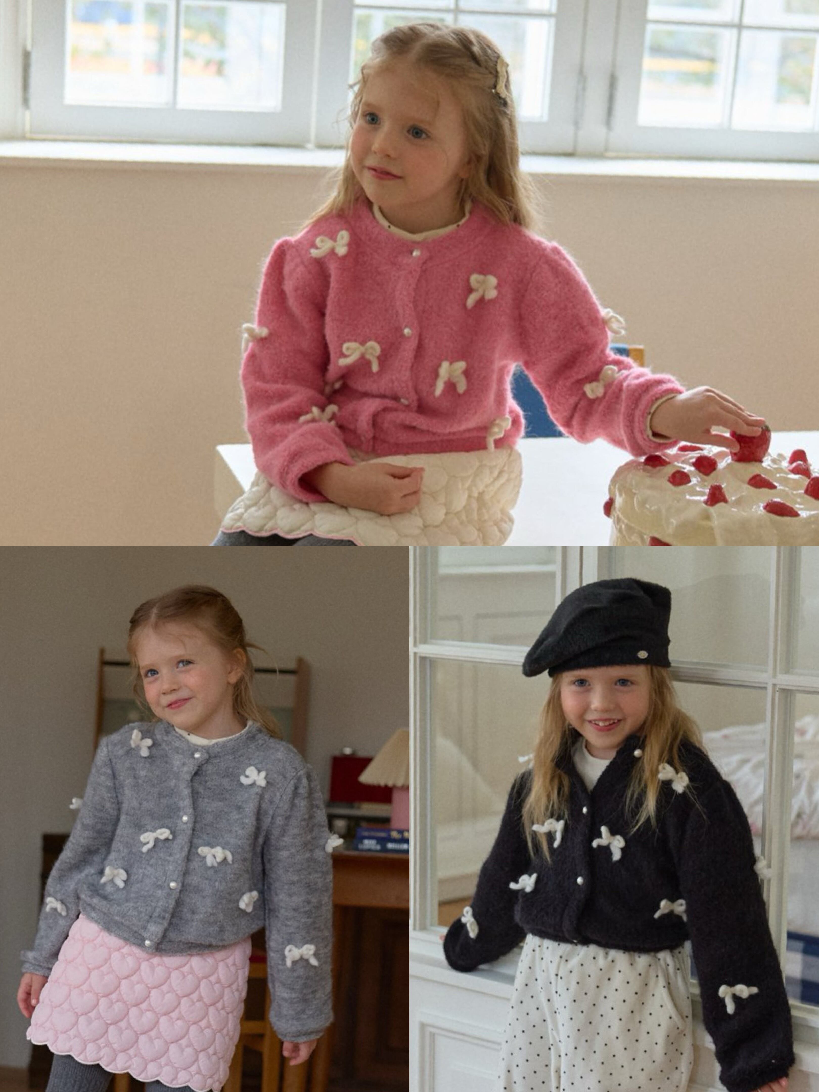 カーディガンはウールを含む素材で、リボン装飾は毛糸で作られています。