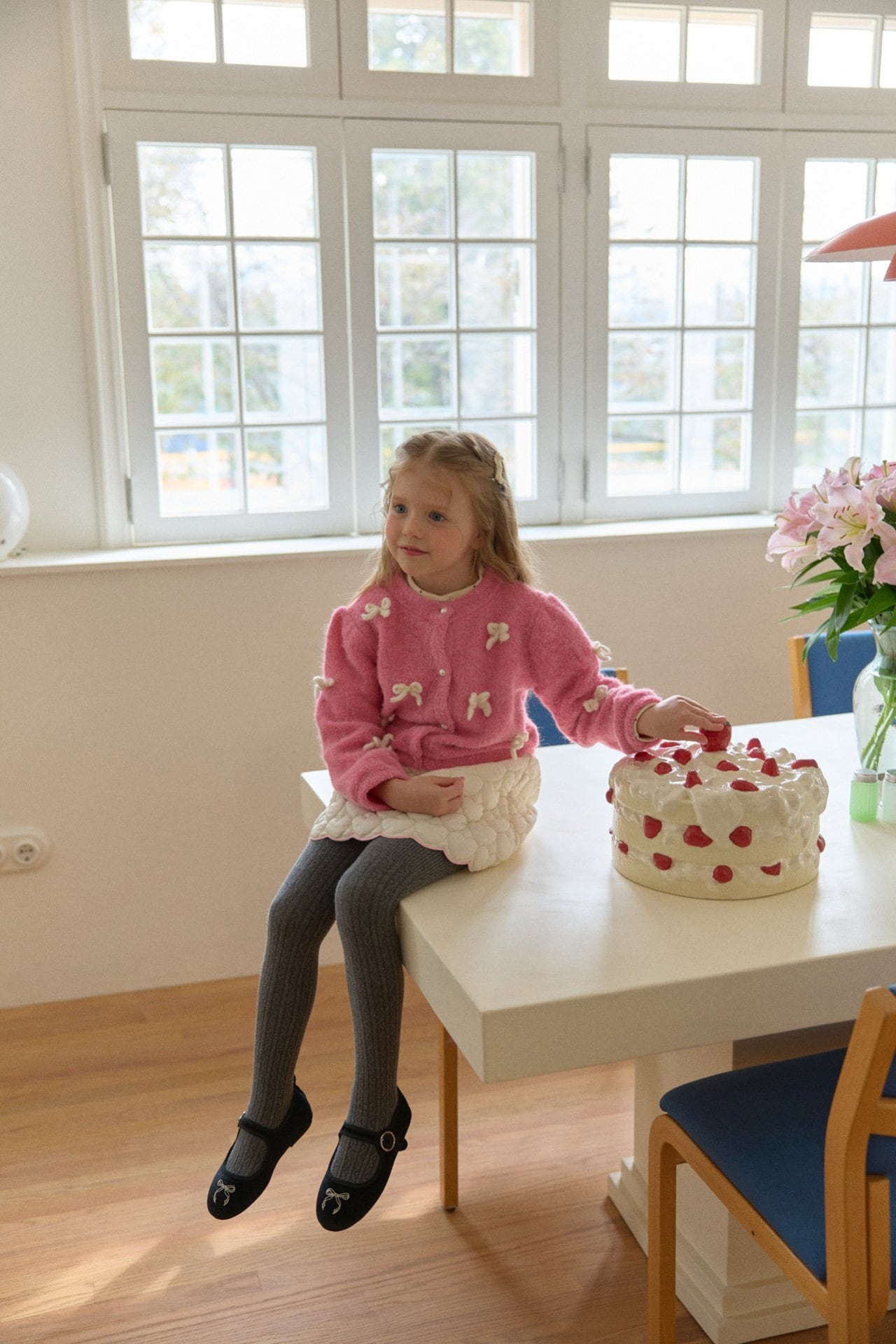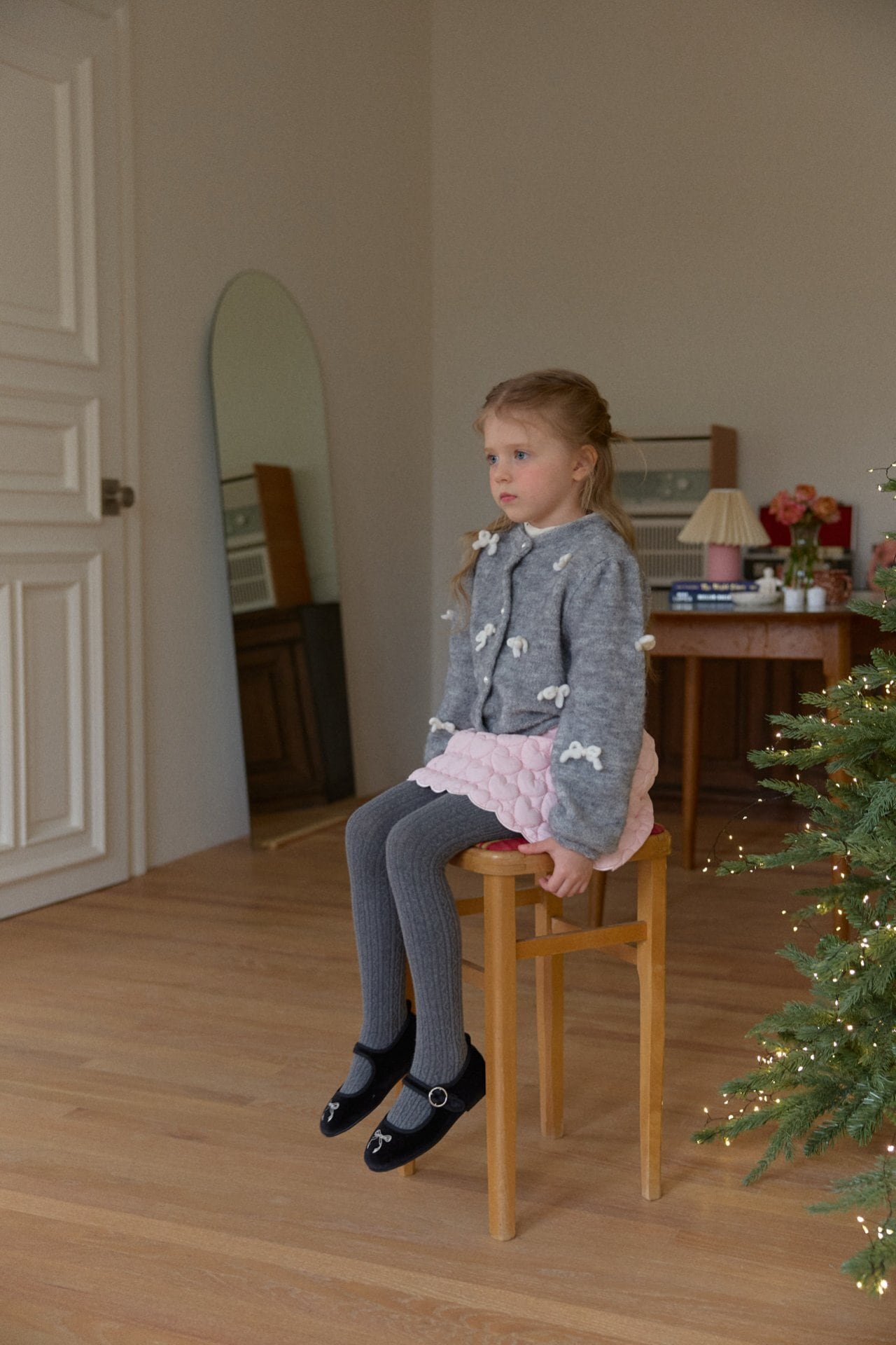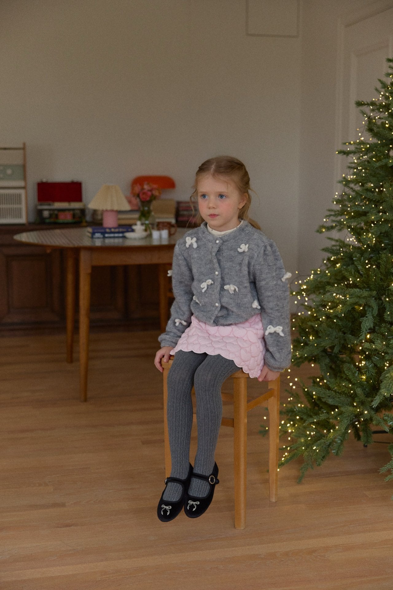 カーディガンはウールを含む素材で、リボン装飾は毛糸で作られています。