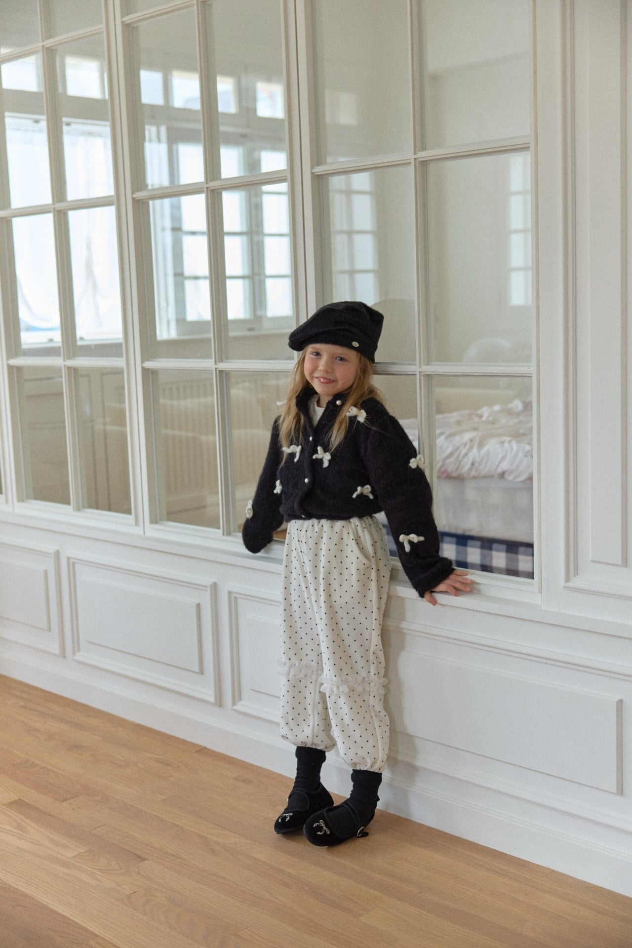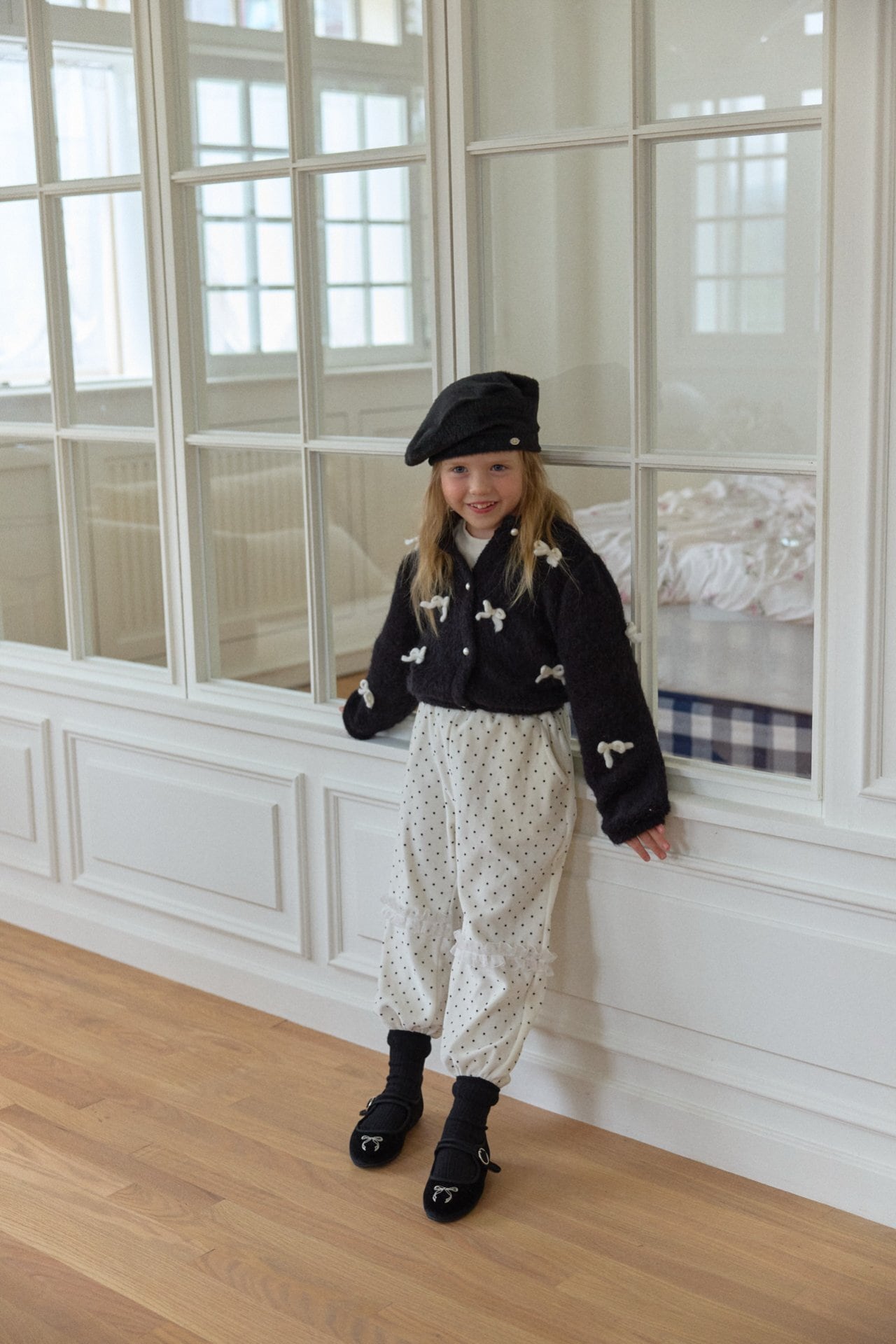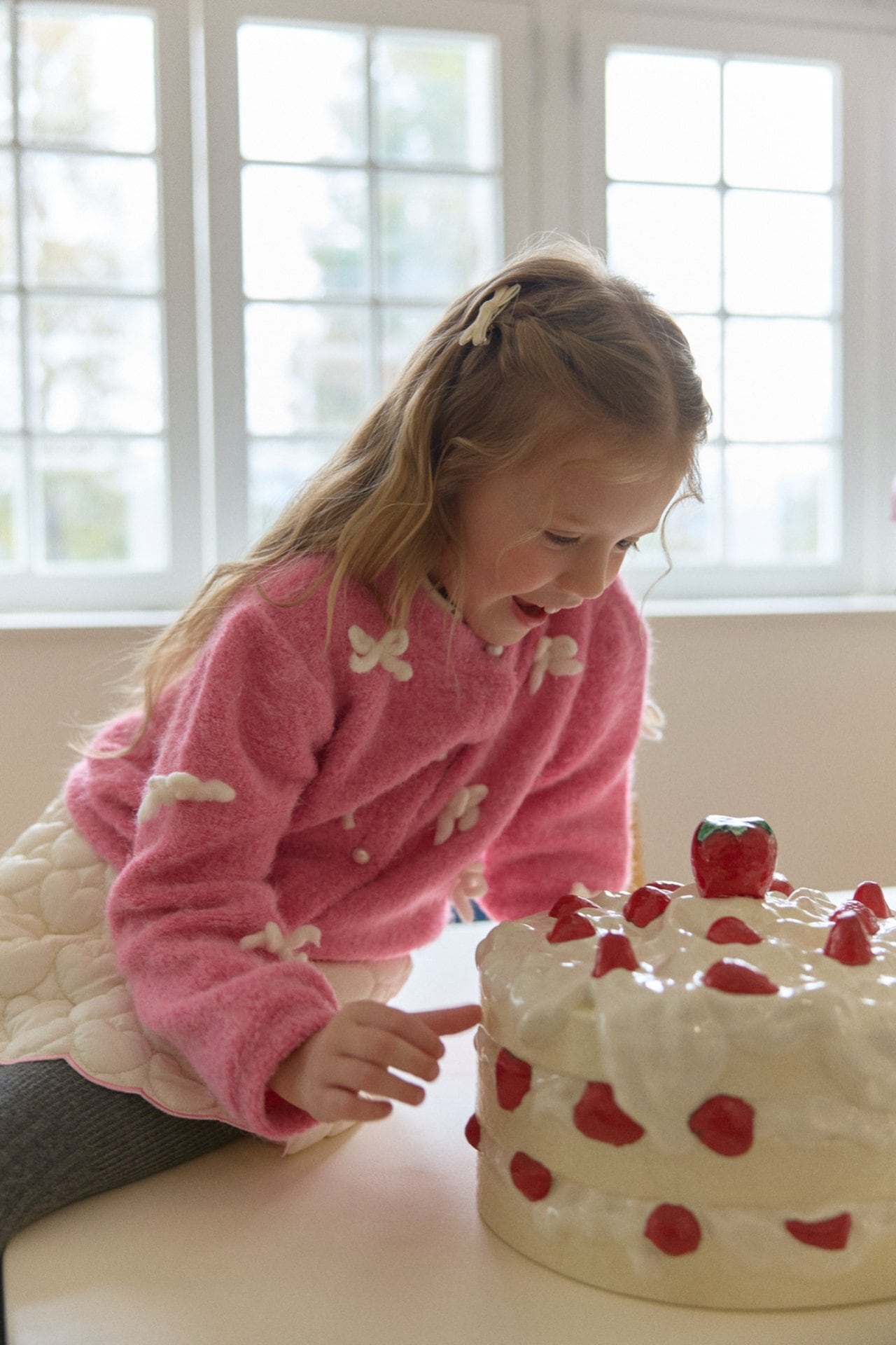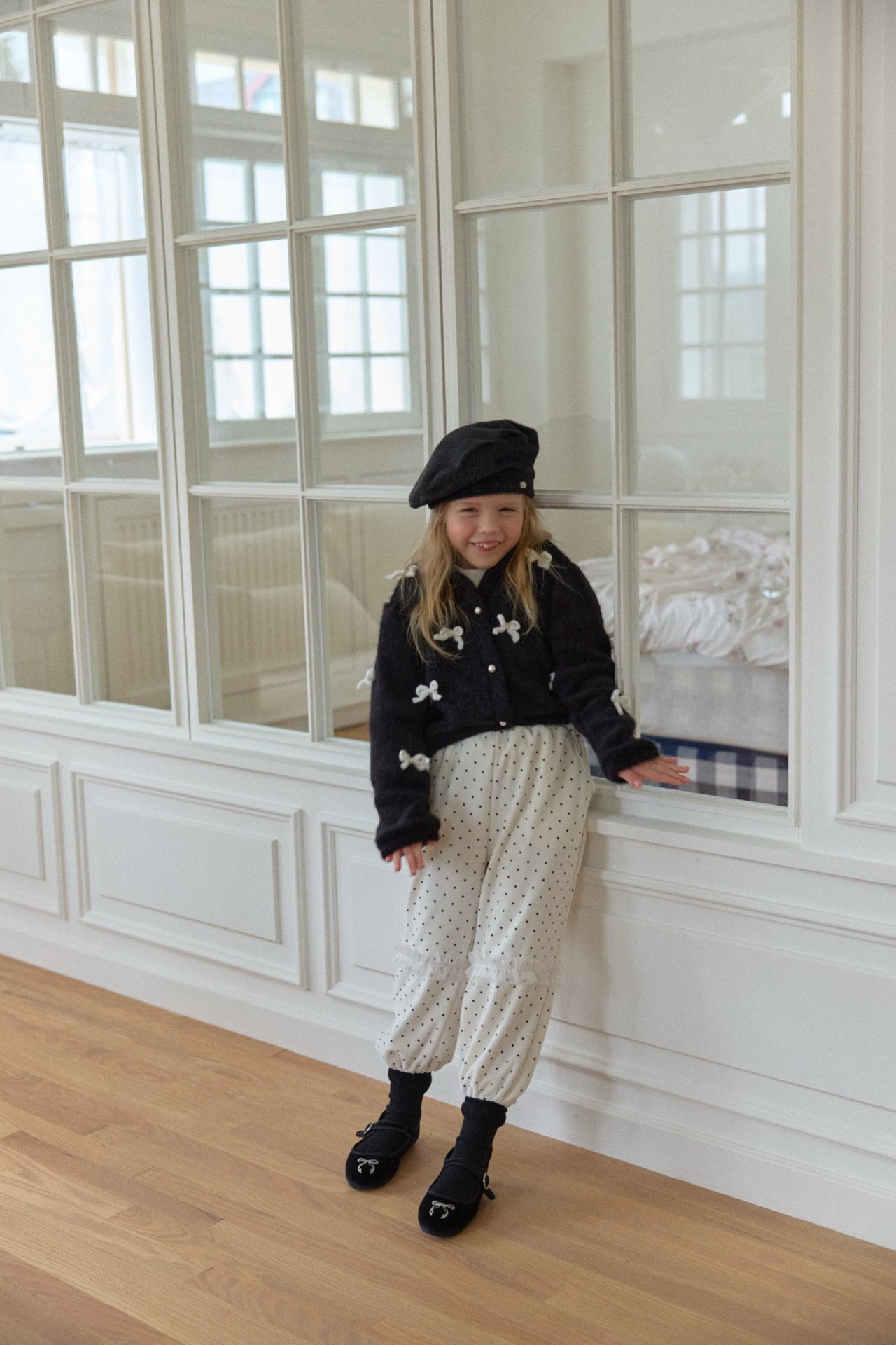 カーディガンはウールを含む素材で、リボン装飾は毛糸で作られています。